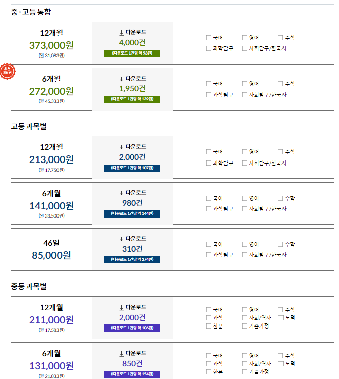 과목별 이용권은 중/고등 통합과 중등, 고등 과정이 구분되어 서비스되며, 기간과 과목 선택에 따라 비용이 산정됩니다.