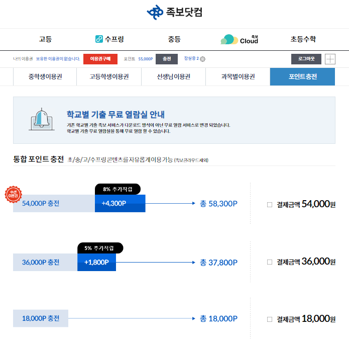 포인트 충전을 하려고 할 때, 중학생 이용권 서비스를 이용하면 건강 1,100원(포인트)이 아니라 몇백 원 수준으로 이용 가능하다는 안내가 나옵니다. 제 생각에 자녀가 여러 명 있는 경우나 학교 시험 외에 준비하는 대회가 있다거나 하는 식으로 많이 사용할 필요가 있는 경우에는 기간별 이용권을 사용하는 것이 괜찮을 것 같습니다.
